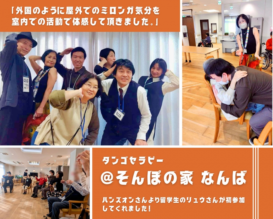 初参加のタンゴ未経験のボランティアさんも、利用者さんとのミロンガを楽しまれていました。「皆んなで踊る時は左回りで」とお伝えすると、その場で揺れるだけでなく、立てる方はフロアを左回りで回る雰囲気が生まれ、全体なミロンガ会場になりました。
