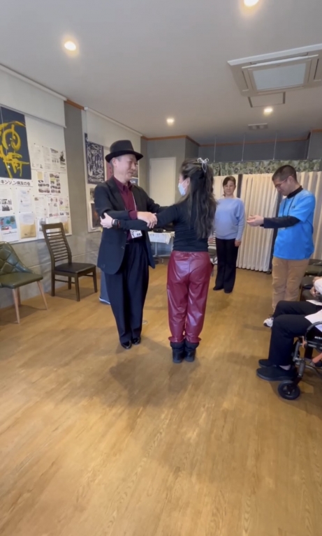 後半は、ダンスタイム。以前利用者様から、「いつも踊っていると、部屋の真ん中に集まってしまうの。」と言われたので、ひと工夫。今回は、部屋の真ん中に障害物として椅子を並べて、LODに踊る練習をしてみました。すると、「これならすんなり踊れるわ。」と言われましたが、