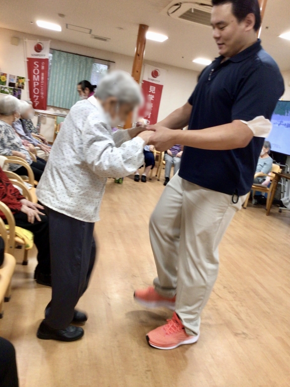 ダンスタイムが始まってからは、施設職員さんもサポートに入ってくださり、あっという間に時間が過ぎました。スバームさんは、もう慣れた様子で皆さんをお誘いしていました。