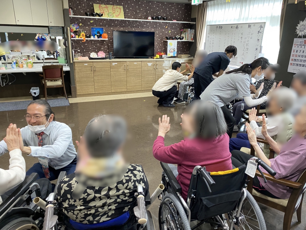 活動が始まると、最初はなかなか声が届かず、ストレッチやリズム運動の際に身体がなかなか動かせない方もちらほらいらっしゃいました。 それから少しずつ時間と共に皆さんが体を動かすようになられ、半分くらい時間が経った時には、ほとんどの方が自ら動かれていました。