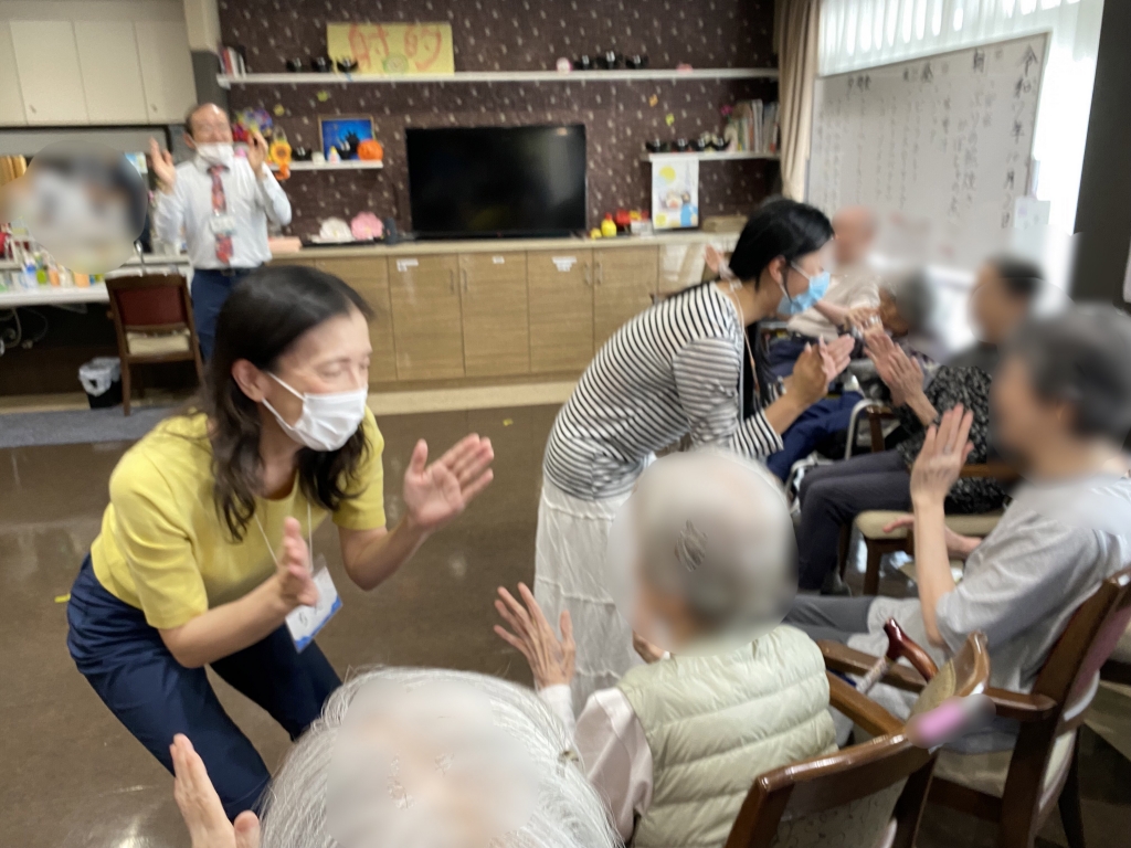 その後は、皆様とのダンスタイム。車椅子をお使いの皆様も半分くらいの方はしっかり立ち上がり、わたしたちや職員さんがサポートしながら、しっかりと踊られていました。
