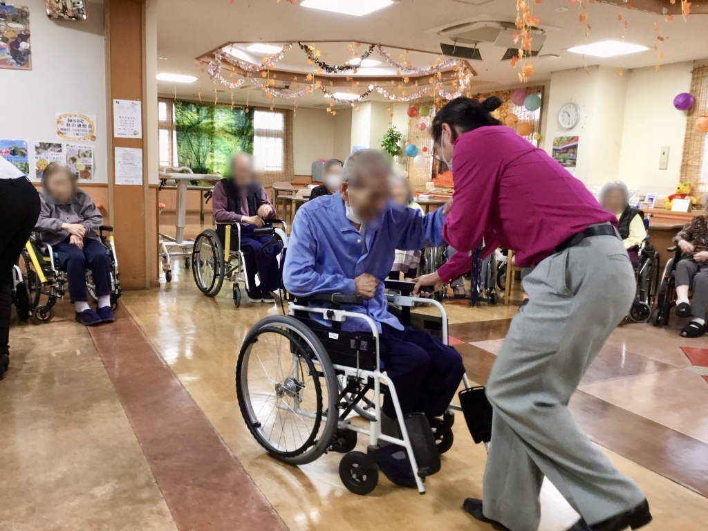 そして皆さんとステップ練習をして、 ダンスタイムへ。立ち上がることのできる方は2割くらいですが、それでも座ったまま皆さんと踊り、できるだけ皆さんと踊れるようひろおさんとお1人ずつに声をかけていきます。
