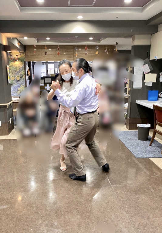 現地に到着してからは、今回初参加のヒセイメイさんに安全レクチャーをして本日は7階の会場へ。会場へ到着すると、まだ皆さんテーブルに座って寛がれていて職員さんが皆様に声をかけられて、タンゴセラピー用にセッティングしてくださいました。