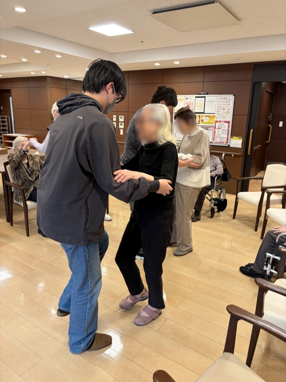 手タンゴやリズム運動を進めていると、一人、また一人とご参加者が到着し始めました。そして、活動が始まって30分が経った頃には、8名の皆様が揃っていました。それから始まったダンスタイムでは、皆さんそれぞれの形で楽しまれていて、身体や表情を動かすのが難しいご利用者様も目線やほんの少しの表情を変えてくださってこちらに気持ちが伝わってくるようでした。