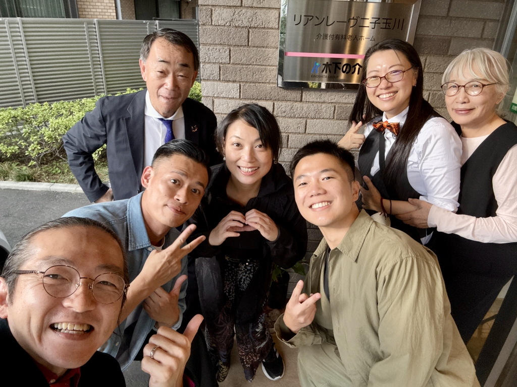 今日は、午前中の虎ノ門での活動にご参加されたセラピストのえみさん、まるちゃん、みほさん、ハンズオン東京からは留学中の大学生のカさん🇨🇳、そして台湾よりタンゴセラピーを学びに来てくださったタンゴダンサーのイファンさんとルンさんと一緒に二子玉川にある有料老人ホーム「 リアンレーヴ二子玉川」へ行って来ました。
