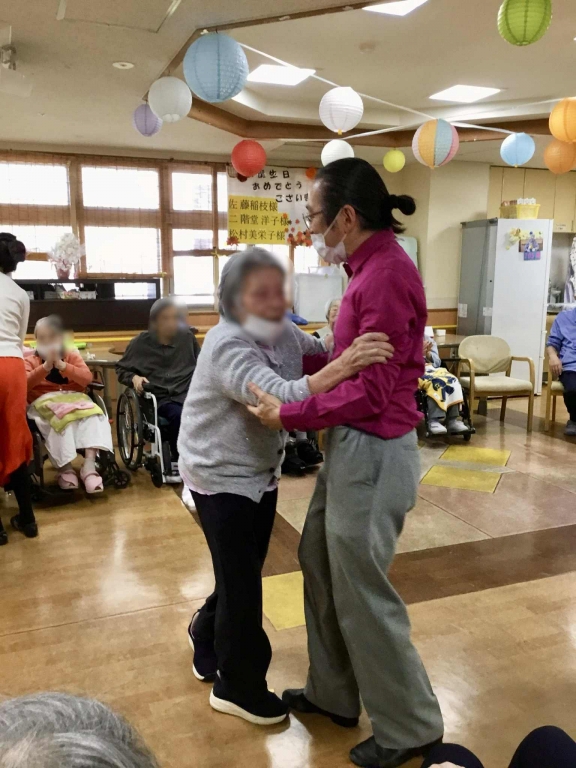 そして皆さまのダンスタイム!お誘いした時は「できないわ~」とおっしゃった方も立ち上がり、軽やかにステップを踏んでくださいました。できましたね!社交ダンスを楽しんでいらっしゃった頃の話をしてくださる女性もいらっしゃいました。素敵な思い出をお持ちなのですね。