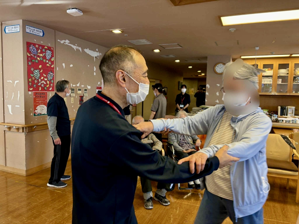 その後は通常のプログラムに戻り、手タンゴやタンゴセラピー体操で準備運動を行い、ステップ練習、ダンスタイムと続きました。こちらの施設は、職員さんも一緒に手伝って入ってくださるため、皆さんとのペアがたくさんできて、ダンスパーティーの雰囲気がしっかり出ていました。