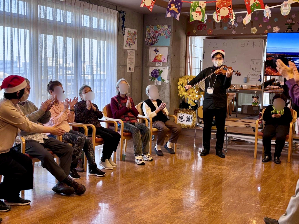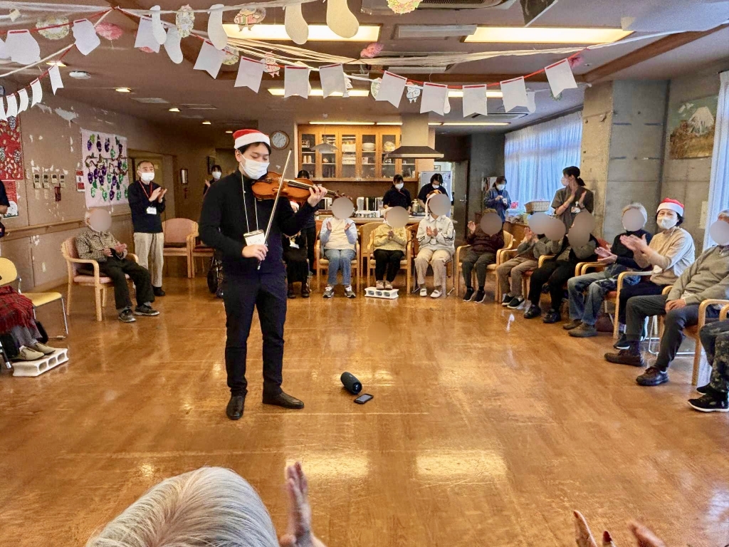 皆さんとのご挨拶の後は、早速ちひろさんによる生演奏タイム。ジングルベルの曲に合わせて皆で手拍子。だけでなく、足でリズムを取っている方や身体を揺らしている方、皆が音楽を楽しんでいるのが伝わってきました。
