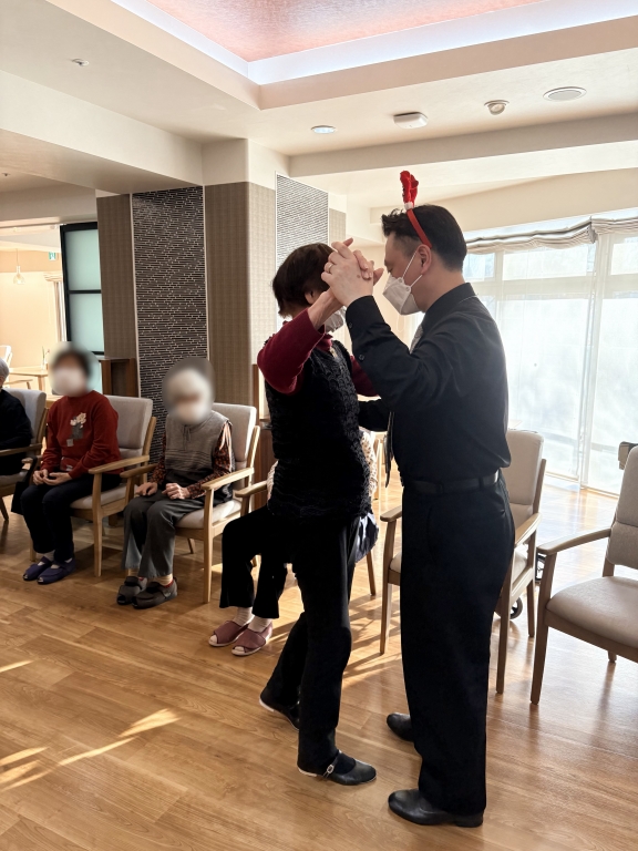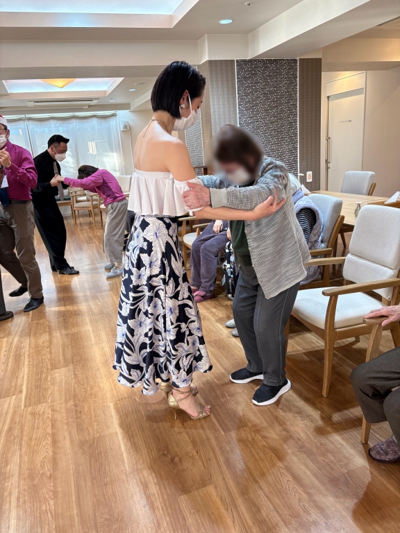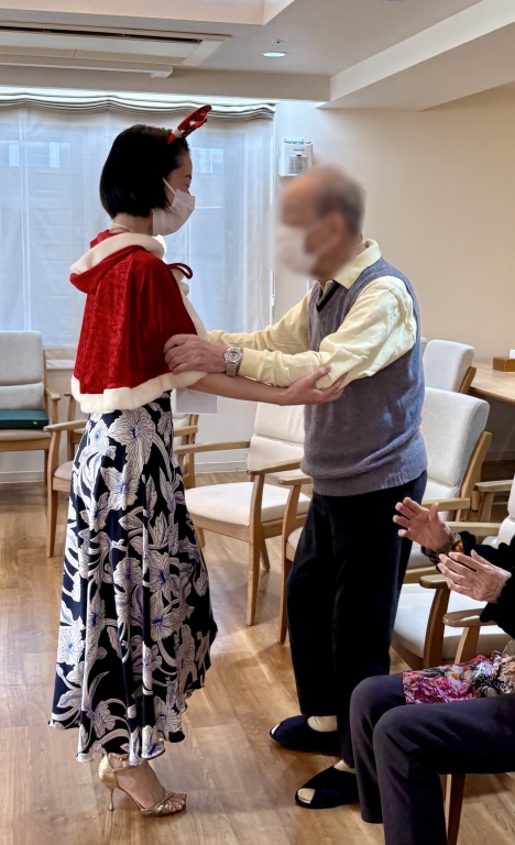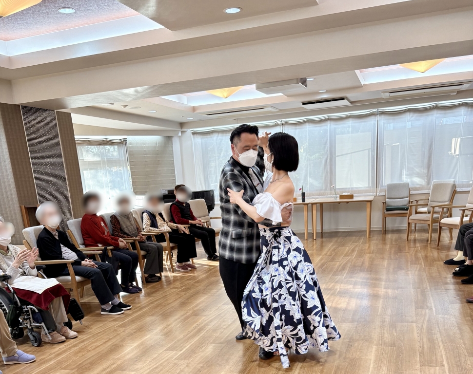 そして、その後は、パフォーマンスタイムに。タンゴとワルツを2曲踊ってくださったのですが、お一人のご利用者様が、「素敵よ〜!素敵よ〜!」と終始お二人に声をかけられていたのが印象的でした。