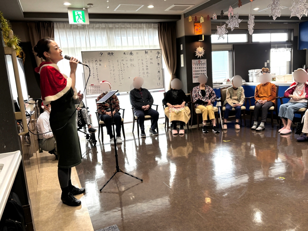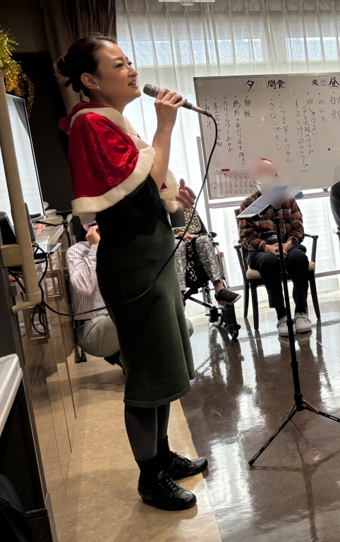 ボランティアメンバーはリーダーのケニーさんと私まりこの二人ですが、でも、今日はスペシャルゲストがいらっしゃるのです!歌手のみほさんが来てくださいました!音響機材の重いスーツケースを引いて、来てくださいました!クリスマススペシャル🎄で素敵な歌を皆さまにお届けします。
