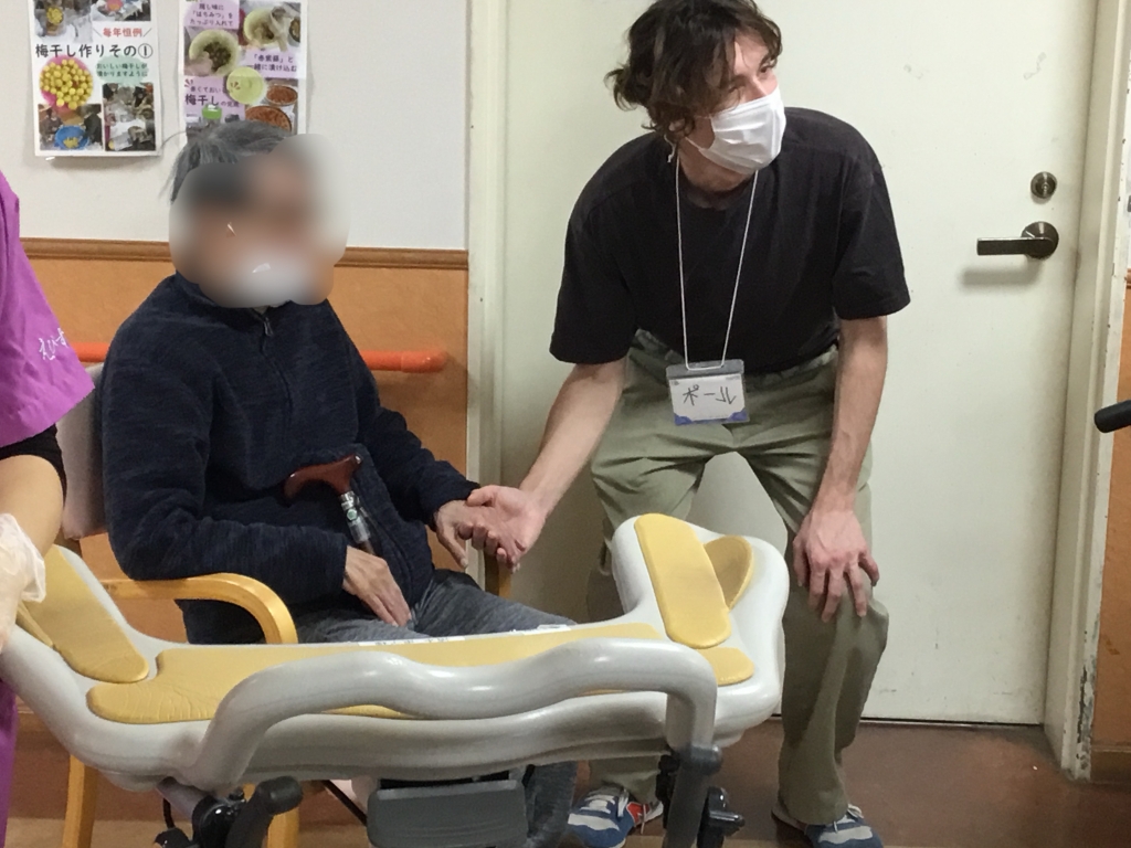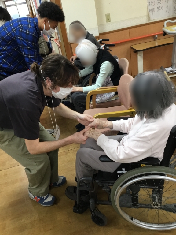 メンバー紹介ののちおひとりずつとご挨拶、ストレッチから手タンゴ、リズムエクササイズとプログラムが進みます。今日のボランティアメンバーは背の高い人が多く、特にジュダさんとポールさんは背が高くて、皆さまからは「うわ~、大きいのね」「あら、高校生なのね~」などの声が聞こえてきました。