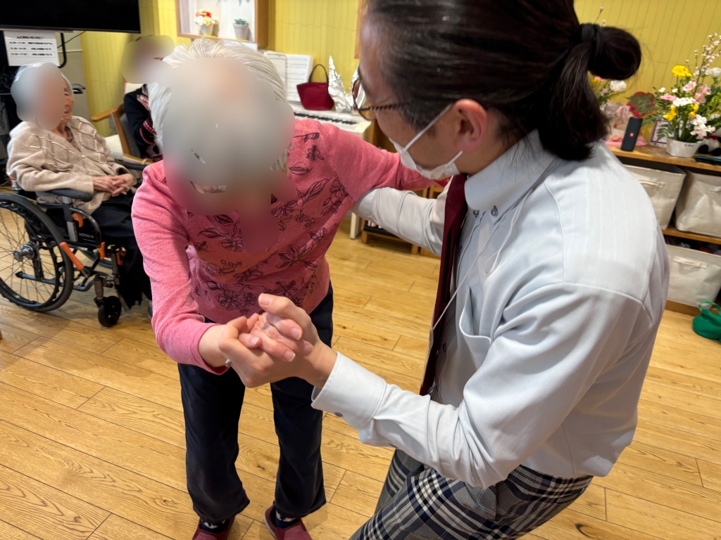 音楽や社交ダンスを楽しんでいらした方が多いこの施設、リズムに合わせて上手にステップを踏んでくださいます。