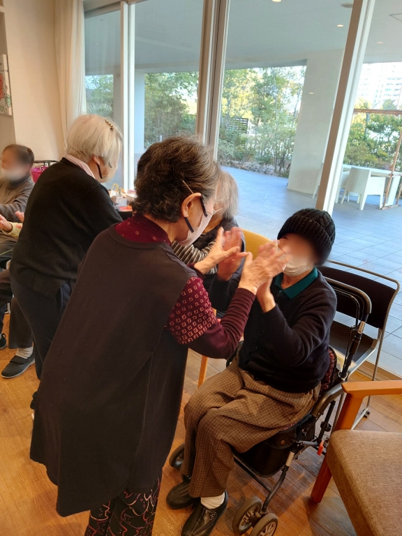 想像以上に近隣の参加者様は立位がしっかりされ、積極的な方々が多く、リズムハイタッチのエクササイズから私達と一緒にハイタッチで利用者のところへ順番に回って交流を楽しんで下さいました。 ステップ練習では、こちらがお誘いしなくても積極的にお知り合い同士でペアになり、チャレンジして下さいました。