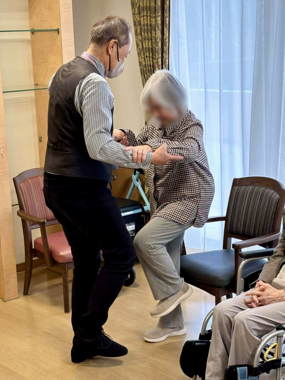 お茶を飲んで休憩していただいてる間、あやちゃんとだいすけさんがデモを踊りました。タンゴというダンスを見たことがなかった利用者さまやとくちゃんは、不思議そうに、でもうっとりとしながら観られていました。