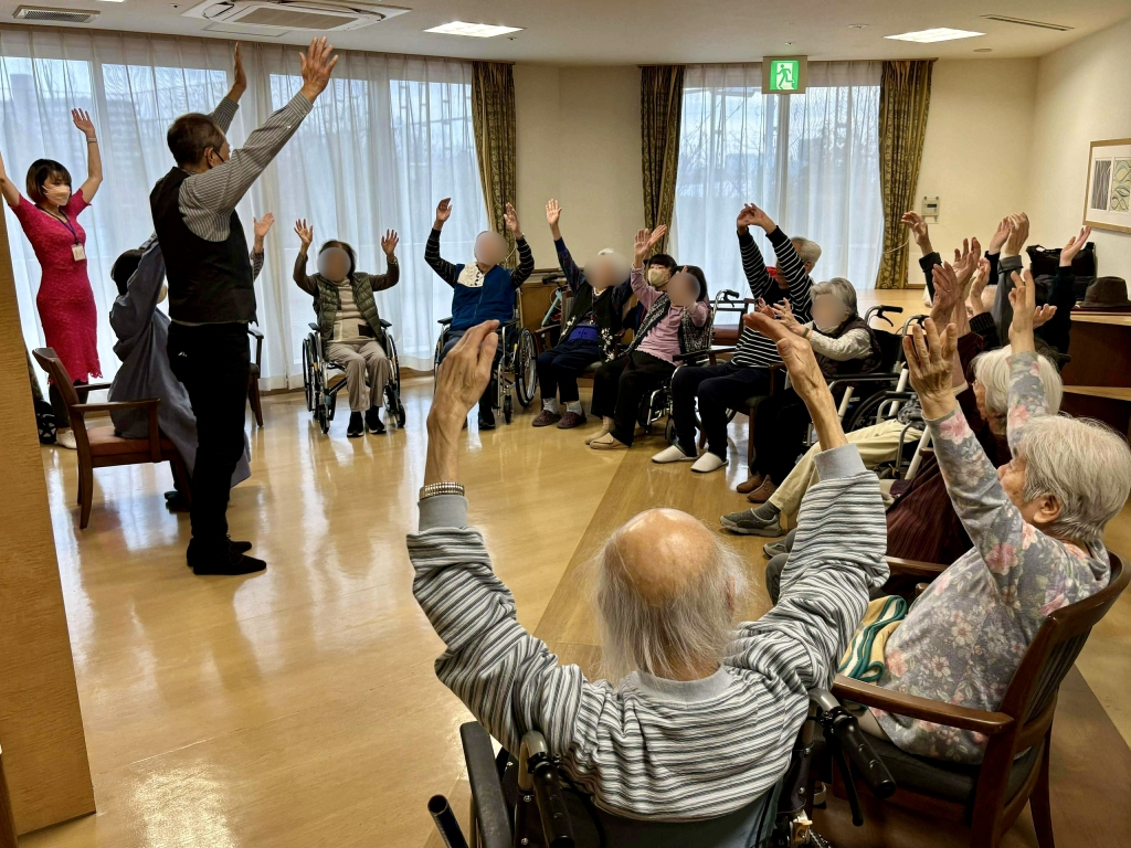 今回から1階のスペースでの開催になり、タンゴの音楽に引き寄せられて来られた方も合わせ、12名の利用者さまが集まってくださいました。 ストレッチで全身をほぐし、手タンゴ、リズムでは音楽を感じながら、皆さま一体となり和気あいあいと楽しみました。