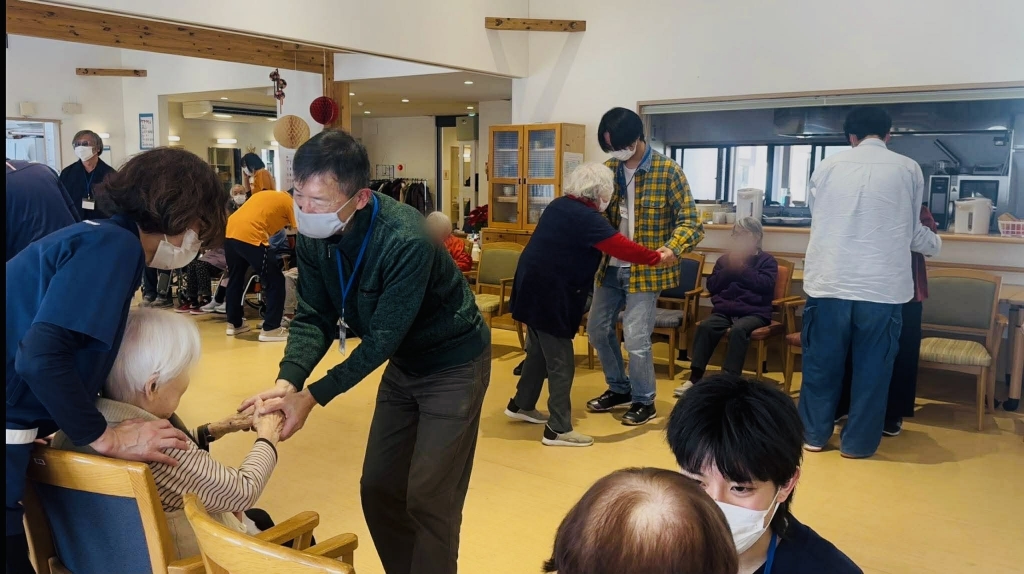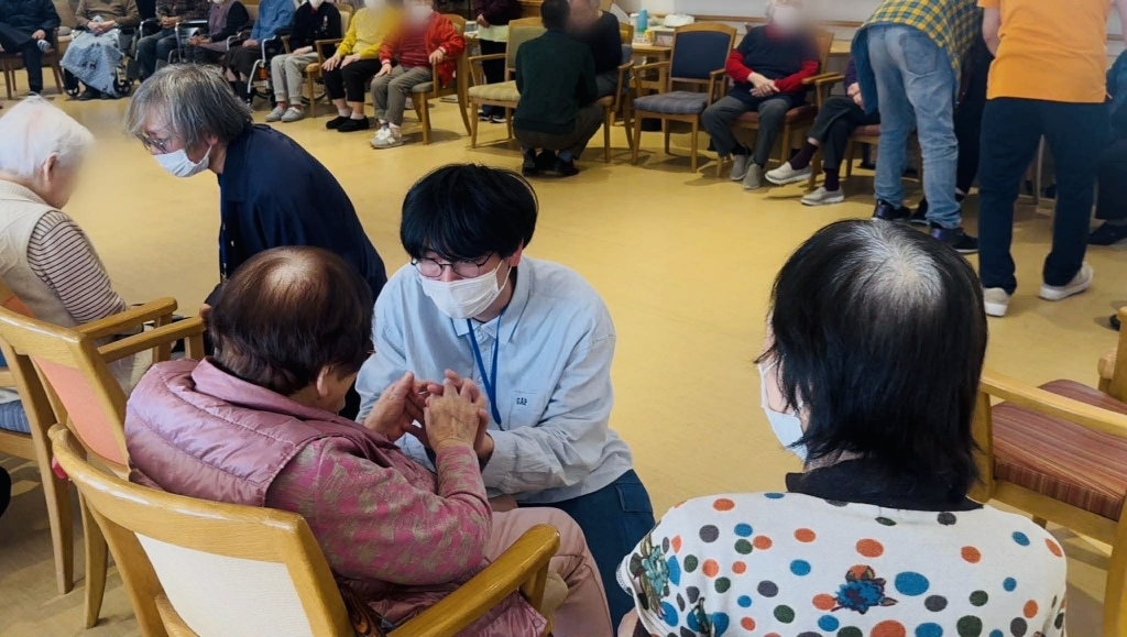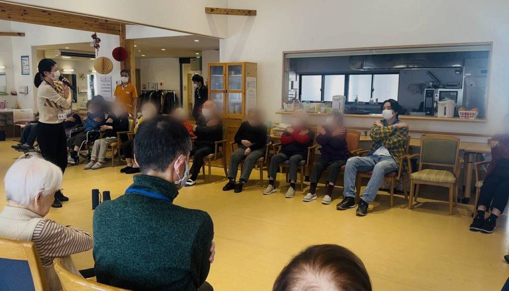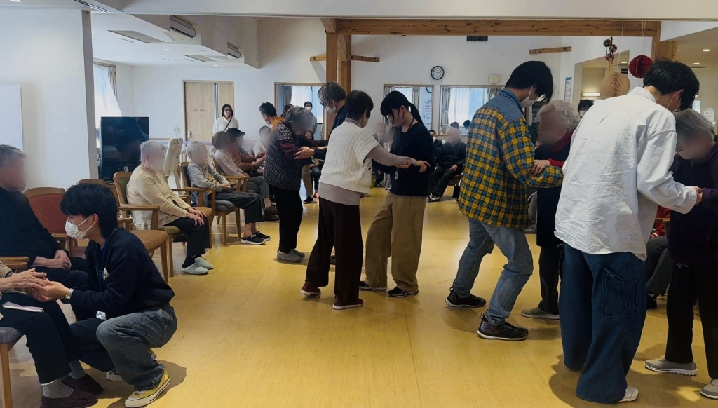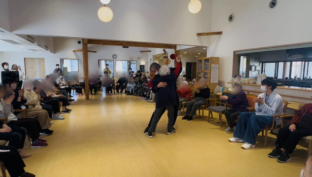 職員の皆様も積極的に一緒に参加してくださり、ご利用者様約30名とともに、今回も笑顔と優しさに満ちた時間となりました。 今回の活動では、2つの新しい試みにチャレンジしました。 ひとつは 「自分で自分の身体に感謝をする」プログラム、もうひとつは 「ご利用者様とタカミさんが踊るタンゴのデモンストレーション」 です。