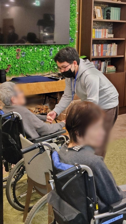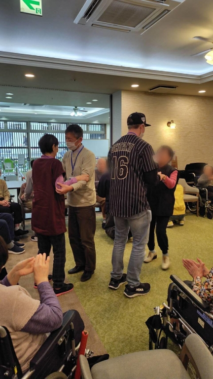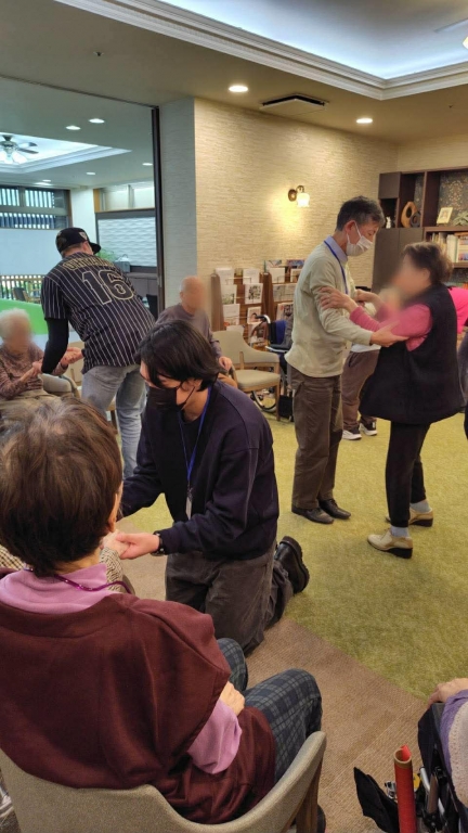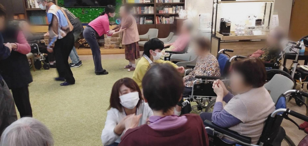 今回は、いつものようにご参加の皆さんの輪の中にボランティアメンバーが入ってスタートしたのですが、いつもとは少し空間の条件が違っていました。 ご利用者様は座位、私たちは立位で距離が近かった為思った以上に圧迫感が出てしまい、少し驚かれたご様子の方もいらっしゃいました。そこで、すぐに私たちも座ったり立ち位置を変えたりして調整。参加人数や会場の広さ、ご利用者様との距離によって、最初の配置を工夫する大切さを改めて学ぶ機会となりました。