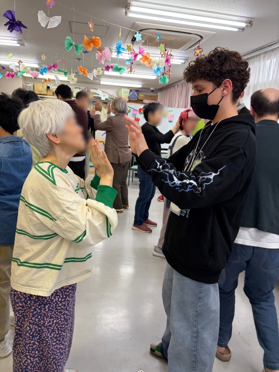 緊張しているボランティアメンバーのところにご利用者様が自然に近づき、手を取って踊り出します。