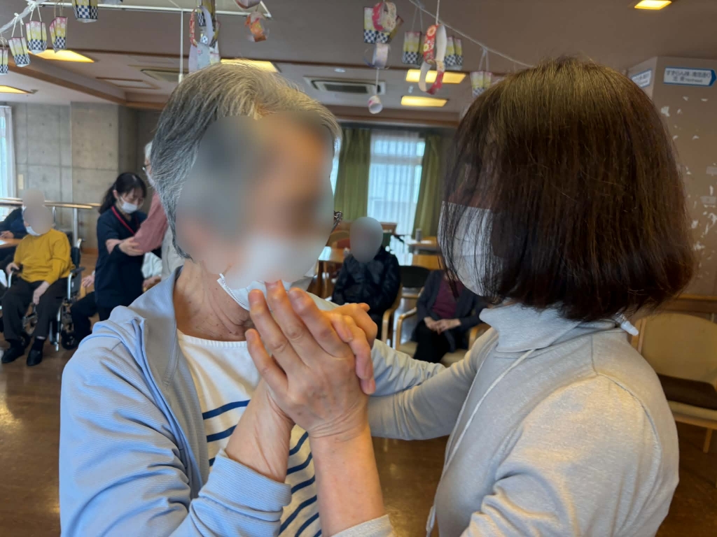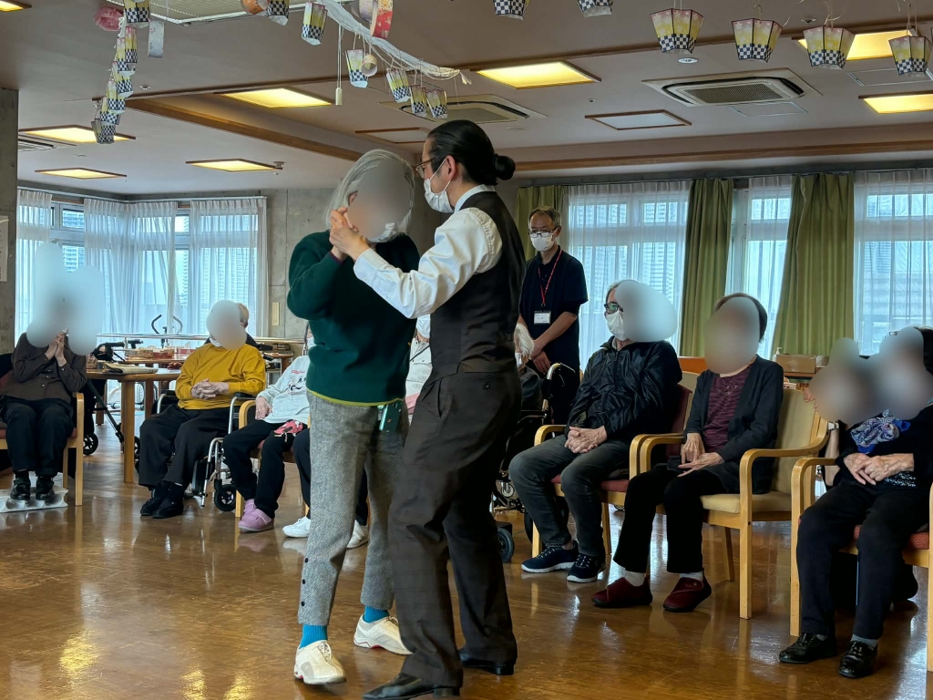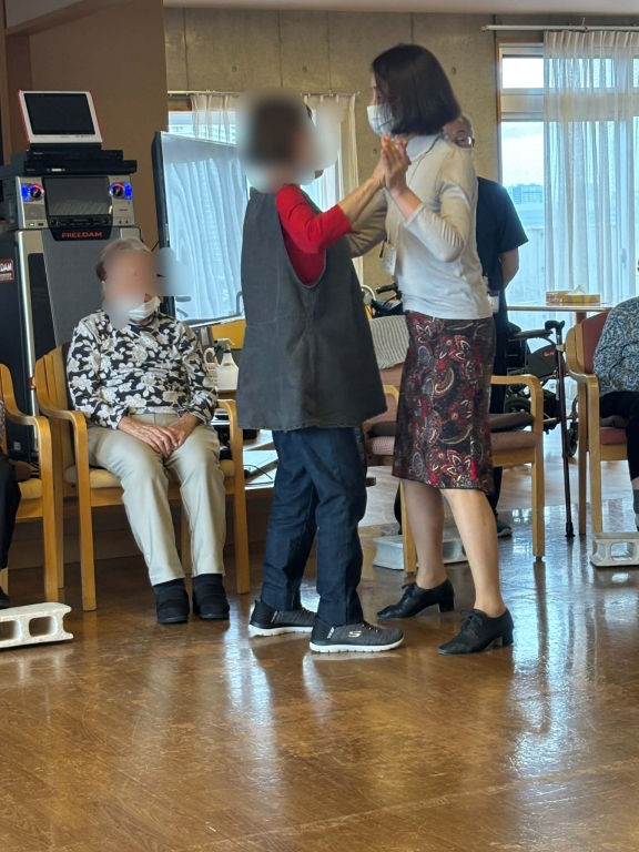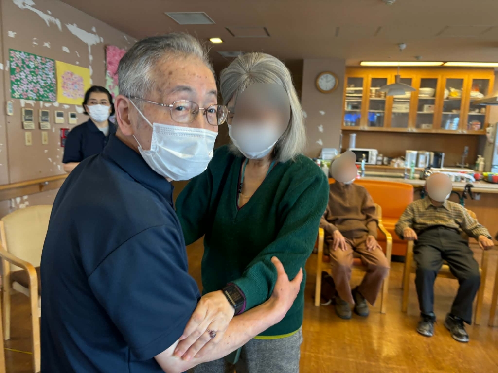 途中休憩では、私と千春さんで踊った後にご利用者様の中で踊りたい方を募ると3名の方が手を上げてくださり、私たち3人と一緒にワルツの曲で踊りました。