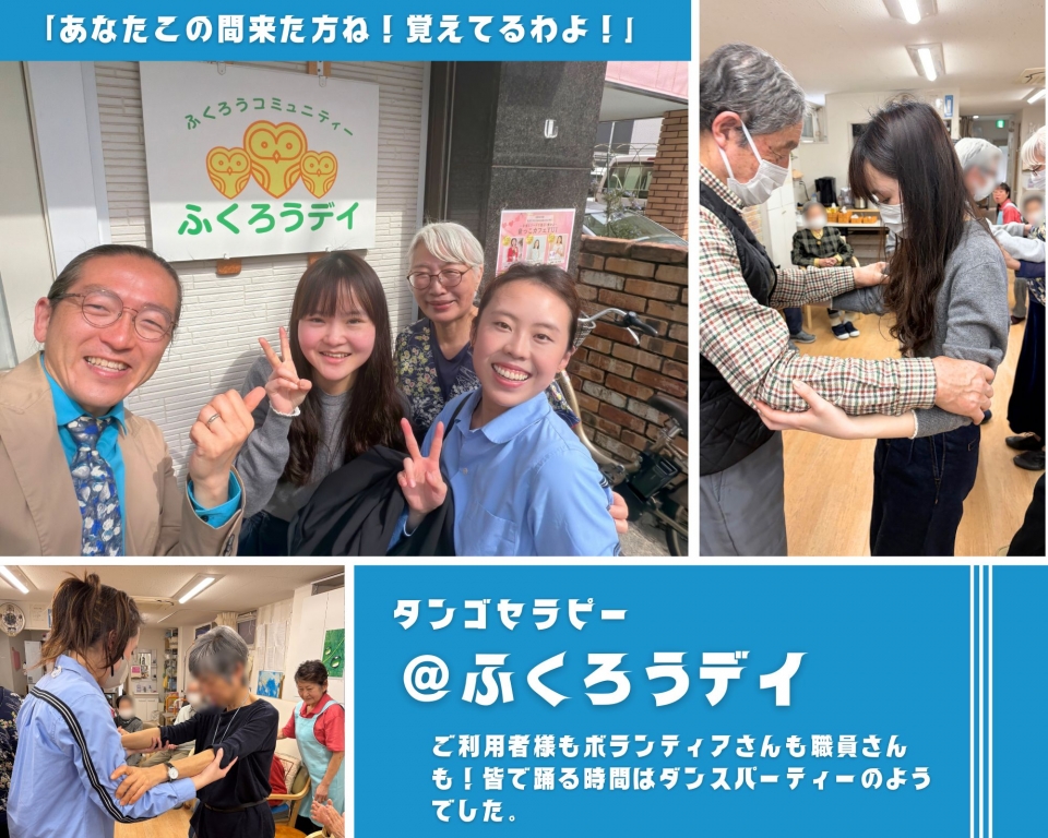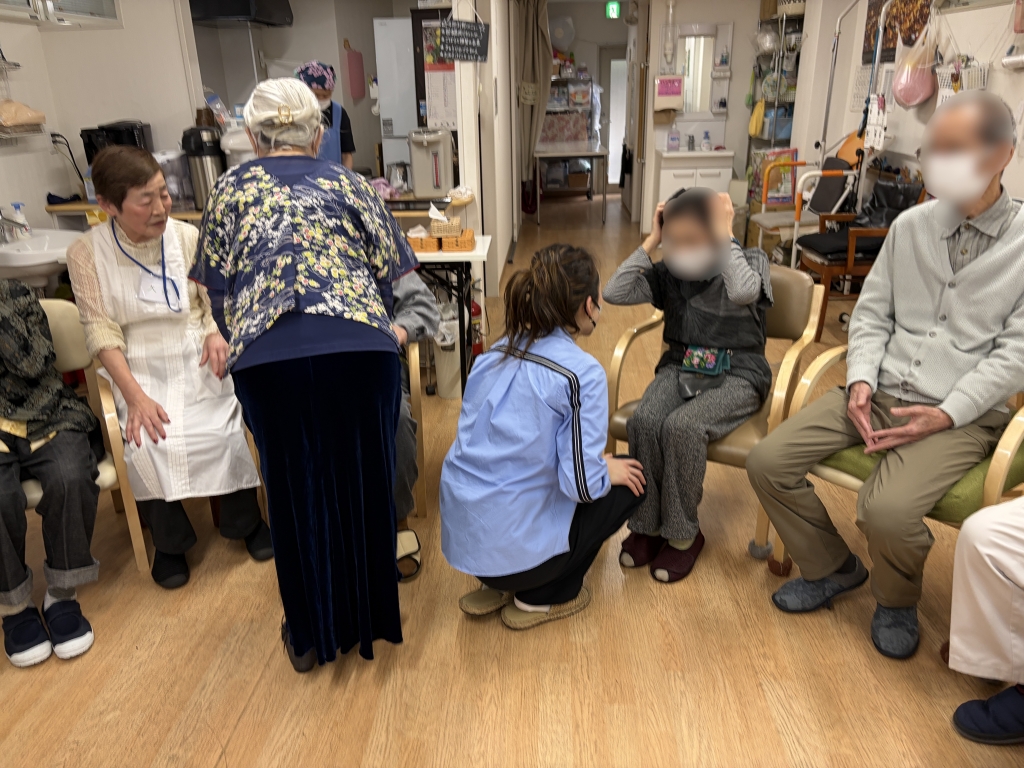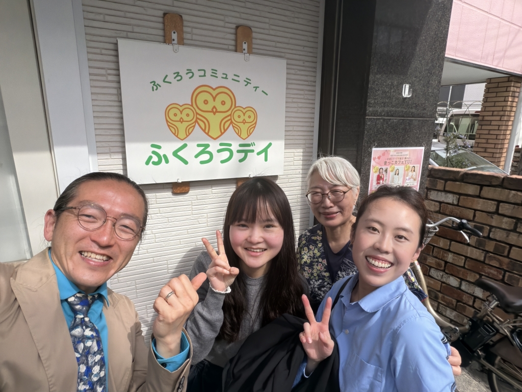 今日は、セラピストのえみさん、そしてハンズオン東京からは、中国からの留学生のシテキヒさんと、台湾からの留学生リュウさんがなんと就活の面接後にご参加くださって、池袋にあるデイサービス『ふくろうデイ』に行ってきました。