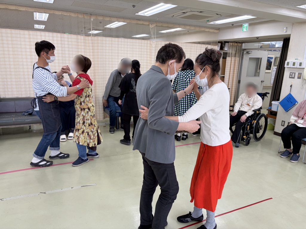 こちらのメンバーは立つことができる方も多いので、できるだけ立位のパートを増やすプログラムで皆さんと踊りました。